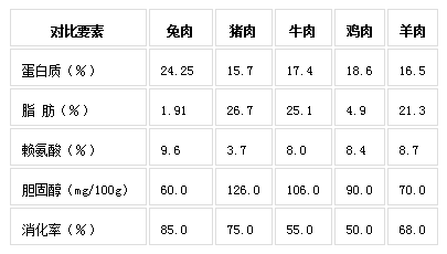 現(xiàn)代科學(xué)研究表明,兔肉營(yíng)養(yǎng)價(jià)值豐富,纖維細(xì)嫩,味道鮮美,適合現(xiàn)代生活對(duì)肉質(zhì)的要求。兔肉具有高蛋白(含蛋白質(zhì)21~23%)、高賴氨酸(賴氨酸占蛋白質(zhì)的9.6%)、高消化率(達(dá)85%)、高煙酸(高達(dá)12.8毫克/百克);低脂肪(僅為4.9%)、低膽固醇(為65毫克/百克)、低脲酸、低熱量等特點(diǎn)。因此,兔肉自古以來(lái)便享有“葷中之素”的美稱。