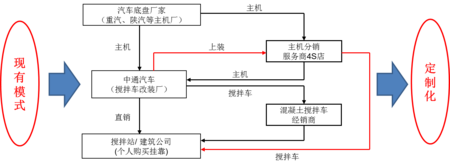 •公司主營(yíng)特種車,伺機(jī)進(jìn)入快速發(fā)展的建筑機(jī)械與混凝土攪拌車市場(chǎng),形成了“汽車底盤采購(gòu)——攪拌車上裝加工——攪拌車經(jīng)銷——客戶”的價(jià)值鏈
