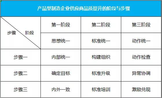 對于制造型企業(yè),供應(yīng)商的品質(zhì)好壞,將直接的影響到產(chǎn)品交付時(shí)間和產(chǎn)品質(zhì)量,從而影響到產(chǎn)品的綜合成本。如何快速讓供應(yīng)商的品質(zhì)明顯提升,本人根據(jù)實(shí)踐案例總結(jié)為三個(gè)階段共九個(gè)步驟,詳見下表: