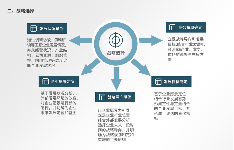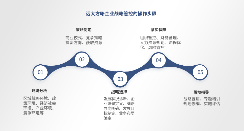 面臨未來更為復雜的發(fā)展環(huán)境,遠大方略將從環(huán)境分析、戰(zhàn)略選擇、策略制定、落實保障、落地指導等方面幫助客戶形成完整的戰(zhàn)略管理體系并推動落地實施。