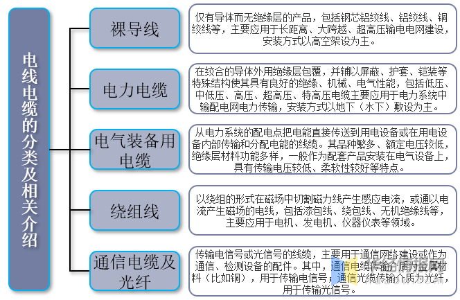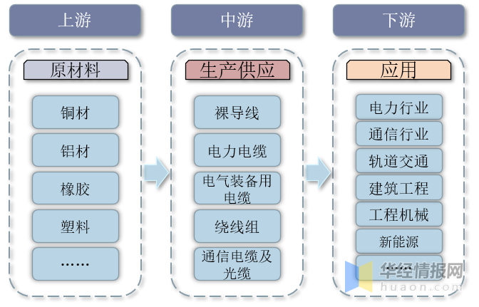 電線電纜行業(yè)產(chǎn)業(yè)鏈上游主要為銅材、鋁材、橡膠、塑料等原材料;中游為電線電纜生產(chǎn)供應(yīng)環(huán)節(jié),主要產(chǎn)品包括裸導(dǎo)線、電力電纜、電氣裝備用電纜、繞線組、通信電纜及光纖;下游廣泛應(yīng)用于電力、通信、軌道交通、建筑工程、工程機械、新能源等領(lǐng)域。