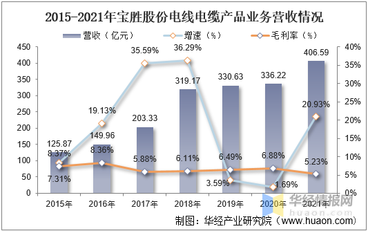 寶勝科技創(chuàng)新股份有限公司(簡稱寶勝股份)是中國航空工業(yè)集團公司旗下的上市公司,公司主要從事電線電纜及電纜附件開發(fā)、制造、銷售及相關(guān)的生產(chǎn)技術(shù)開發(fā)。公司產(chǎn)品覆蓋裸導(dǎo)體、電氣裝備用電纜、電力電纜、通信電纜及光纜等,是我國電線電纜行業(yè)主要龍頭企業(yè)之一。據(jù)資料顯示,2021年寶勝股份電線電纜產(chǎn)品業(yè)務(wù)營收為406.59億元,同比增長20.93%,毛利率為5.23%。