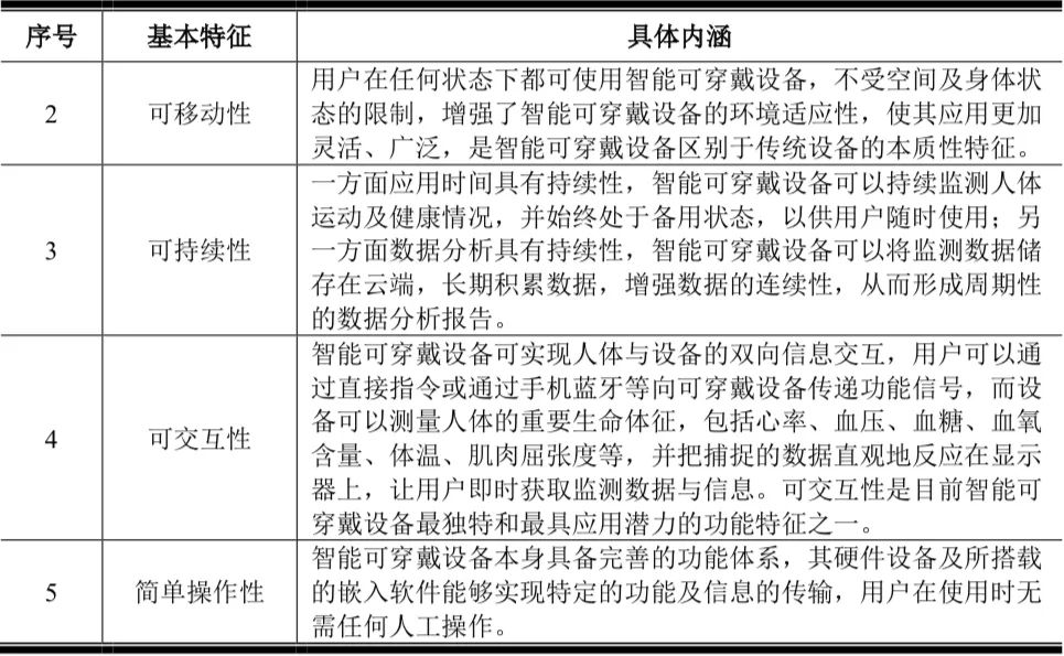 智能可穿戴設(shè)備是物聯(lián)網(wǎng)技術(shù)、移動互聯(lián)網(wǎng)、云存儲技術(shù)和大數(shù)據(jù)技術(shù)不斷融合創(chuàng)新的最佳載體,具有可穿戴性、可移動性、可持續(xù)性、可交互性以及簡單操作性五大基本特征,各個特征的具體內(nèi)涵如下表所示: