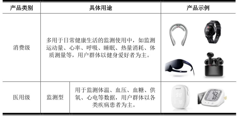 而從產(chǎn)品的性質(zhì)來看,智能可穿戴設(shè)備主要分為消費級智能可穿戴設(shè)備和醫(yī)用級智能可穿戴設(shè)備。消費級智能可穿戴設(shè)備主要針對普通人群,通過運動監(jiān)測、肌肉放松、康復(fù)理療等方式實現(xiàn)用戶的自我健康管理和健康狀況改善,代表性產(chǎn)品包括健康手表、可穿戴按摩儀、智能腕帶等常見產(chǎn)品,以及智能服裝、書包、鞋襪等各類非主流產(chǎn)品形態(tài);而醫(yī)用級智能可穿戴設(shè)備主要服務(wù)對象為各類疾病患者人群,為特定疾病患者人群提供監(jiān)測防范和對慢性病患者人群進行治療指導(dǎo),代表性產(chǎn)品有血壓計、血糖儀、血脂檢測儀、可穿戴心率除顫器等。