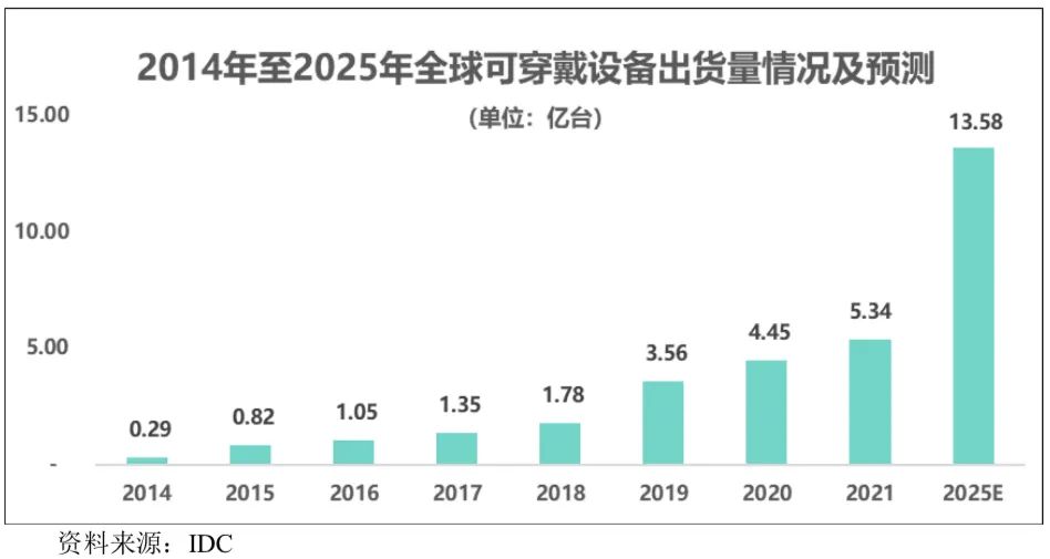 全球智能可穿戴設(shè)備出貨量持續(xù)保持強勁增長。據(jù) IDC 統(tǒng)計數(shù)據(jù)顯示,全球智能可穿戴設(shè)備總出貨量 2014 年-2021 年復(fù)合增長率為 51.69%,其中,2020 年全球智能可穿戴設(shè)備出貨量為 4.45 億臺,同比增長 25.00%;2021 年全球智能可穿戴設(shè)備出貨量為 5.34 億臺,同比增長 20%;預(yù)計 2021-2025 年全球智能可穿戴設(shè)備出貨量復(fù)合增長率約為 26.28%,2025 年預(yù)計出貨量將達到 13.58 億臺。