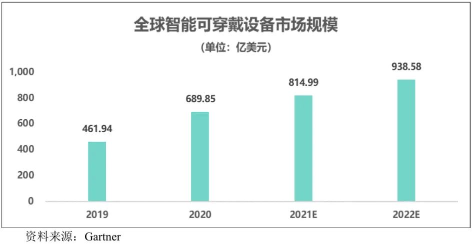 據(jù) Gartner 預(yù)測,到 2022 年全球消費者在智能可穿戴設(shè)備上的支出合計可達到 938.58 億美元,較 2019 年將增長 476.64 億美元,三年間實現(xiàn)近 100%的增幅。