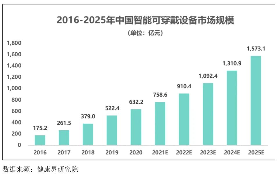近年來,隨著社會經(jīng)濟的發(fā)展與居民可支配收入不斷提高,居民的購買力逐漸增強,良好的經(jīng)濟環(huán)境推動了我國智能可穿戴設(shè)備的普及。2016-2020 年我國智能可穿戴設(shè)備行業(yè)市場規(guī)模由 175.2 億元增長至 632.2 億元,年復(fù)合增長率為 37.8%。伴隨著未來居民健康的意識的進一步提升,以及行業(yè)相關(guān)技術(shù)的進一步優(yōu)化,我國智能可穿戴設(shè)備行業(yè)將擁有更為廣闊的市場增長空間,預(yù)計 2025 年我國智能可穿戴設(shè)備行業(yè)市場規(guī)模將達 1,573.1 億元。