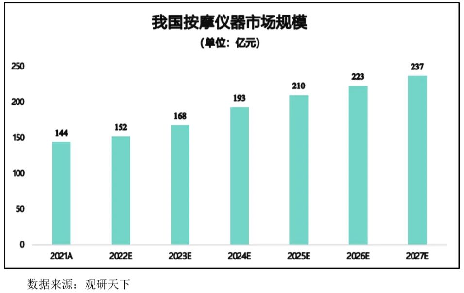 隨著經(jīng)濟的不斷發(fā)展、人們生活水平的日益提高,在消費觀念和消費水平轉(zhuǎn)變與提升的背景下,按摩儀器行業(yè)得以快速發(fā)展。而隨著電子技術(shù)的進步和新材料的應(yīng)用,按摩裝置實現(xiàn)了精確化和小型化控制,用戶體驗的優(yōu)化也進一步推動了按摩儀器的市場發(fā)展。根據(jù)觀研天下數(shù)據(jù),2021 年我國按摩儀器市場規(guī)模達到 144 億元,預(yù)計于 2027 年將增長至 237 億元,年均復(fù)合增長率達到 8.65%。