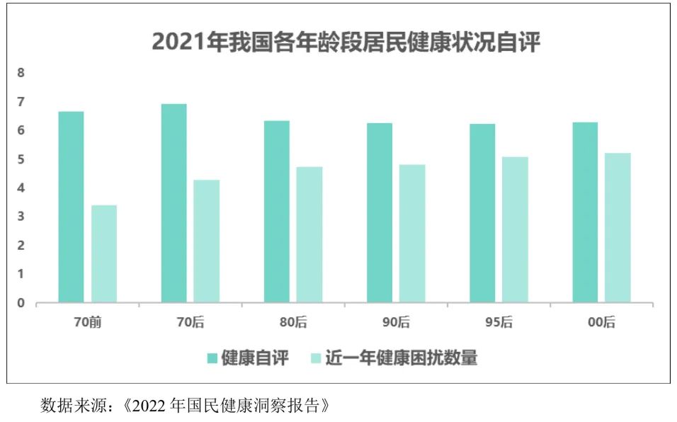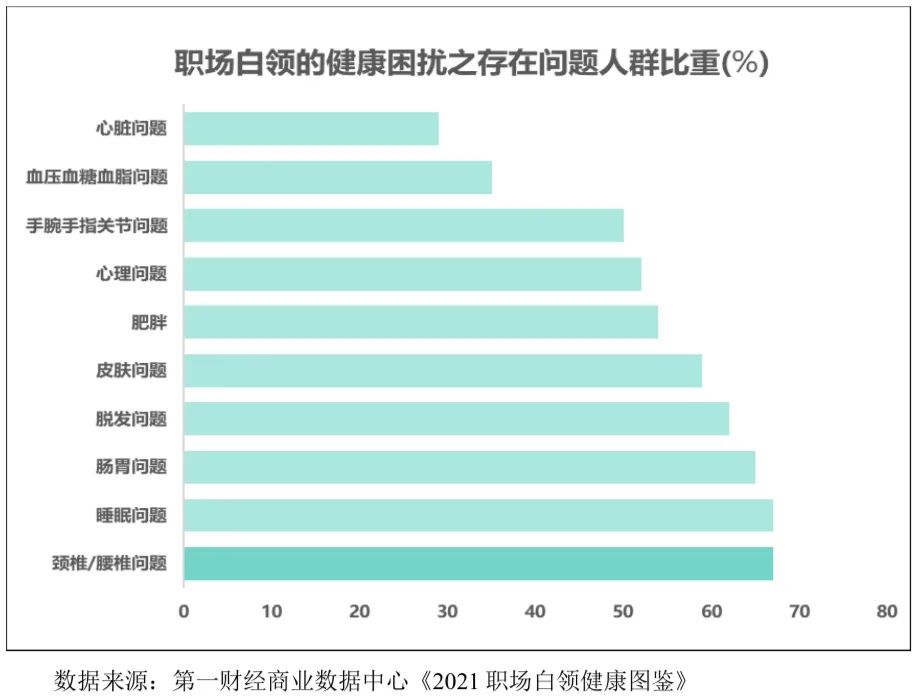 近年來,經(jīng)濟水平的逐步提高使得人們生活節(jié)奏不斷加快,高強度的工作導(dǎo)致職場人士容易進入亞健康狀態(tài),長期受到頸椎、腰椎及血液循環(huán)不暢等慢性病的困擾。據(jù)《2022 年國民健康洞察報告》顯示,在 70 前、70 后、80 后、90 后、95 后、00 后這六個年齡段的人群里,95 后健康自評分最低,00 后近一年健康困擾數(shù)量最多,中青年健康問題日益凸顯。