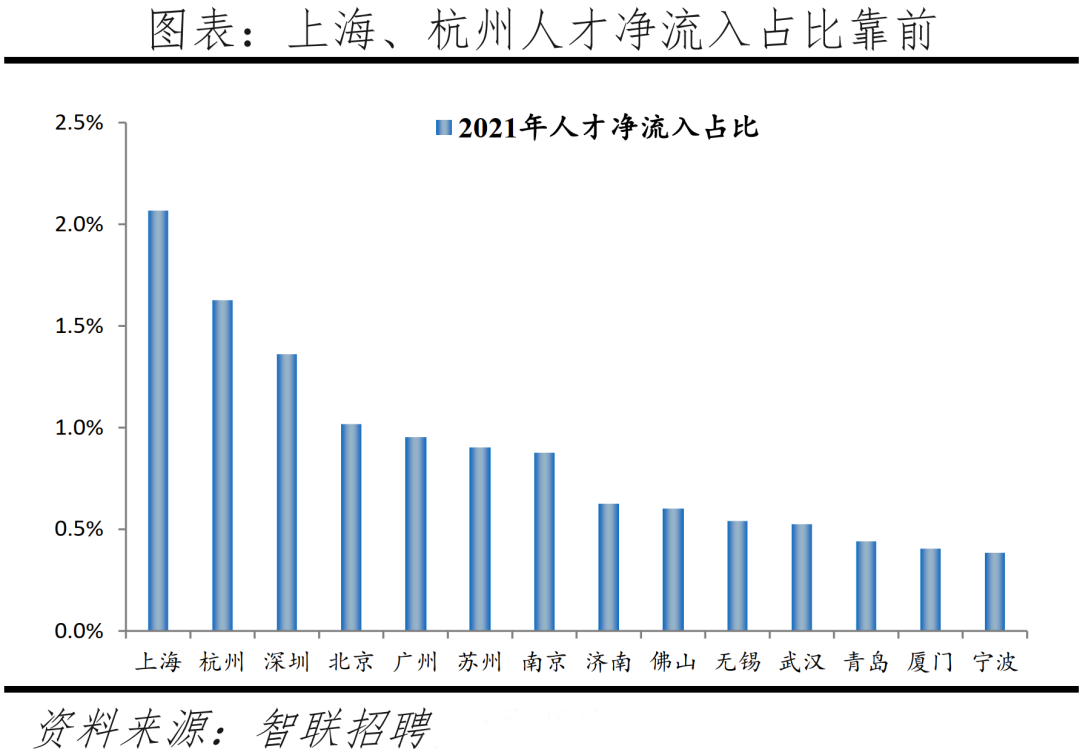 由于北京、上海近年嚴(yán)控人口,人口增量未進(jìn)前十,但是人才凈流入指標(biāo)依然領(lǐng)先,人才仍然傾向去大城市找工作。