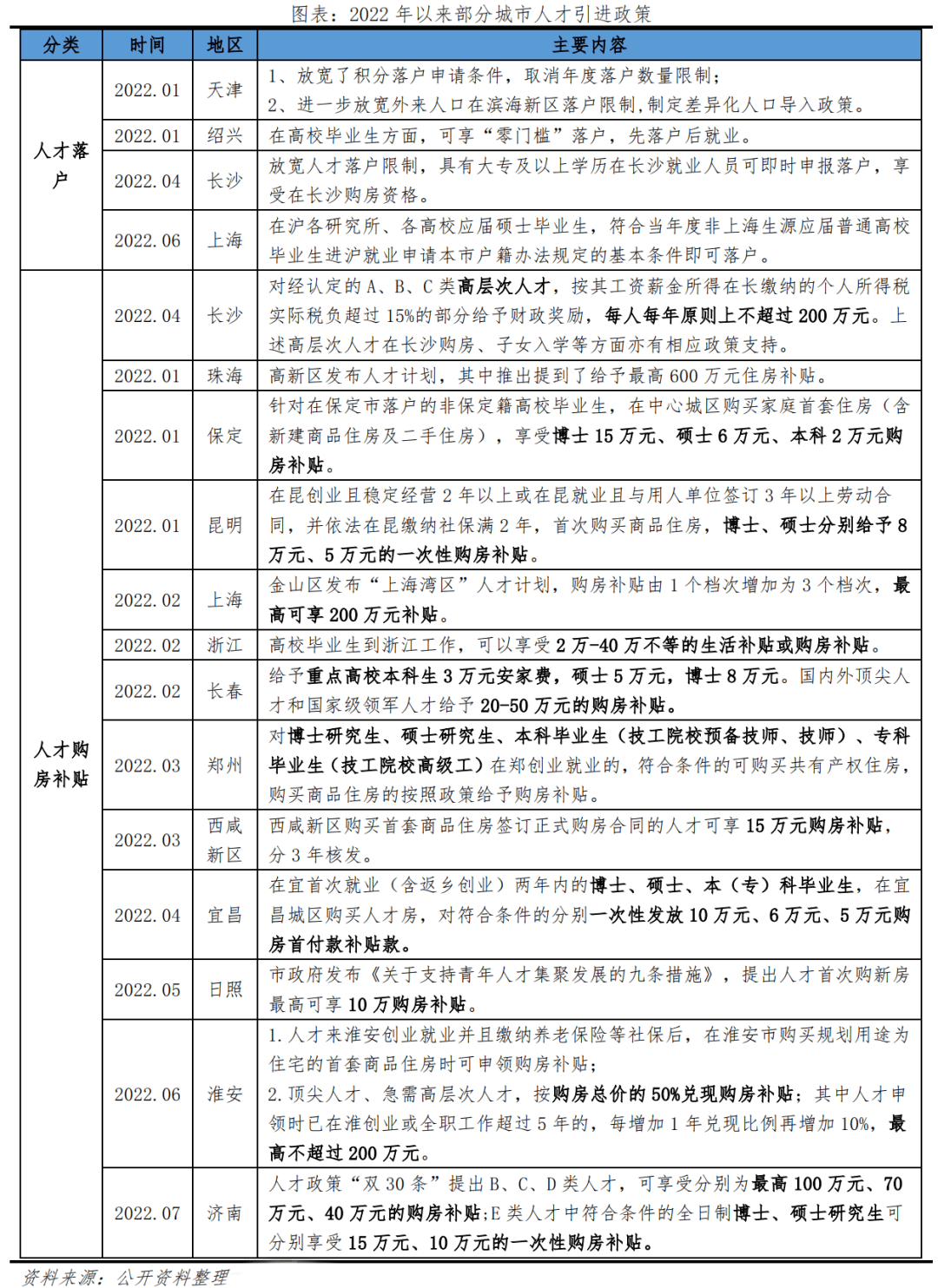2017年初以來,各地掀起“搶人大戰(zhàn)”,城市人才競(jìng)爭(zhēng)不斷升級(jí),2022年以來各地人才政策不斷優(yōu)化,包括放寬人才落戶政策、提供租購房補(bǔ)貼、創(chuàng)業(yè)補(bǔ)貼等,逐漸從“搶人”向“搶人才”轉(zhuǎn)變。
