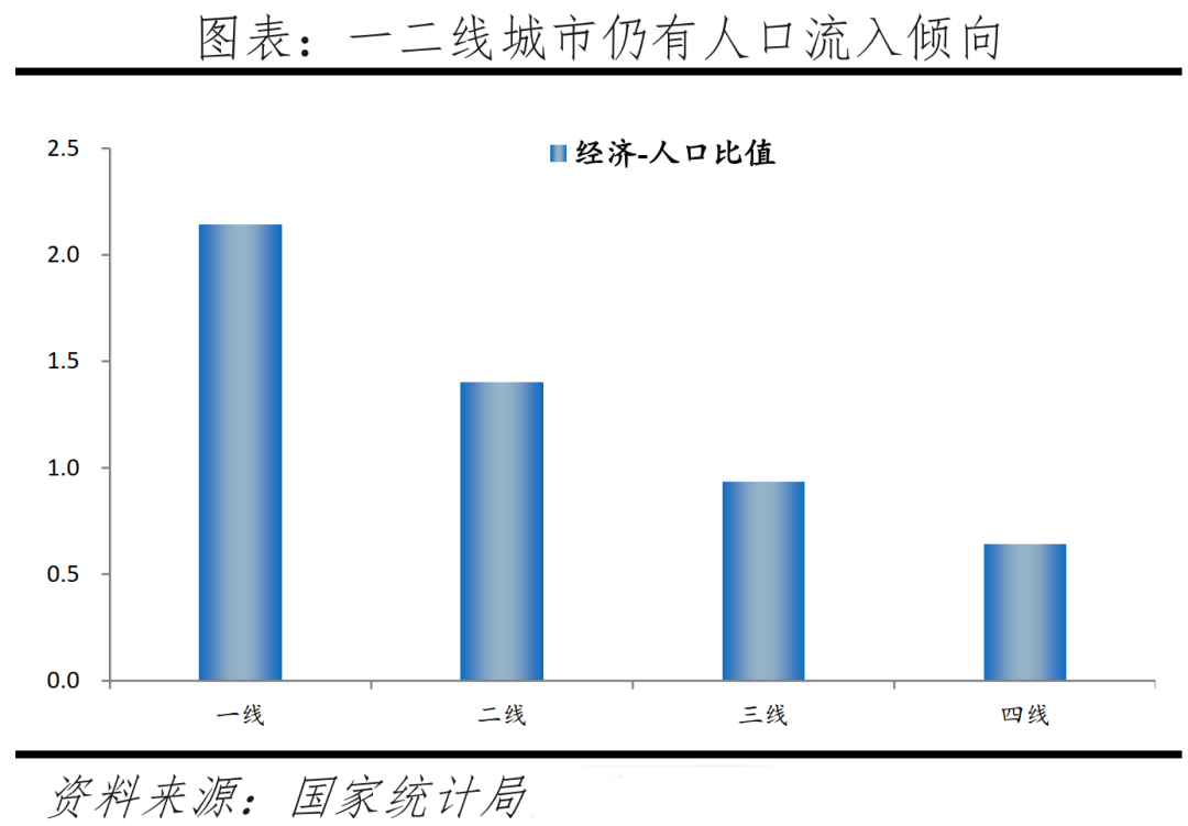 根據(jù)經(jīng)濟(jì)-人口分布平衡法則,某地區(qū)經(jīng)濟(jì)-人口比值大于1,人口有凈遷入趨勢(shì);經(jīng)濟(jì)-人口比值小于1,人口有凈遷出趨勢(shì),所以一二線城市人口仍有凈流入傾向,而三四線城市人口有凈流出傾向。