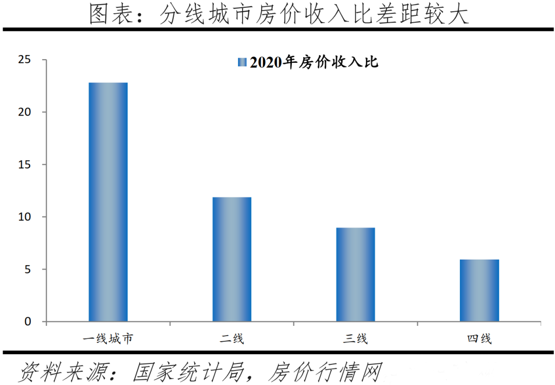 房?jī)r(jià)收入比方面,2020年一線、二線、三線、四線城市房?jī)r(jià)收入比分別為22.8、11.9、9.0、5.9,城市間分化顯著,這與全球其他經(jīng)濟(jì)體核心城市房?jī)r(jià)收入比較高的情況一致。