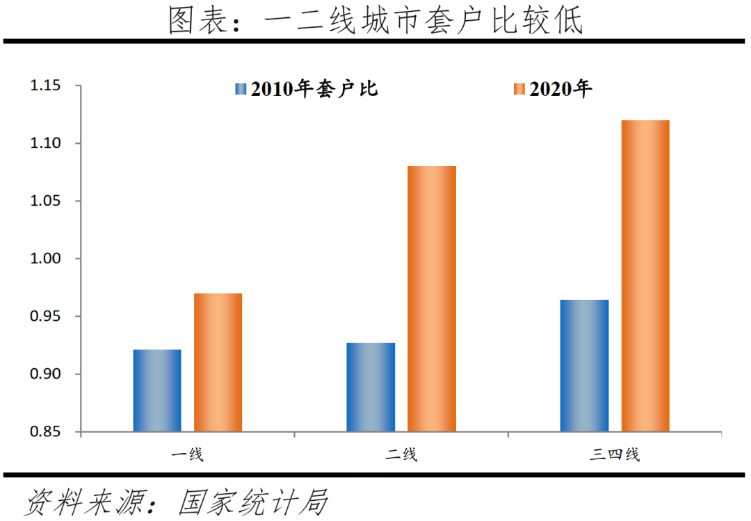 當(dāng)前一二線住房供給偏緊,套戶比分別為0.97、1.08,中部和東北地區(qū)相對(duì)過剩,套戶比分別為1.10、1.13。