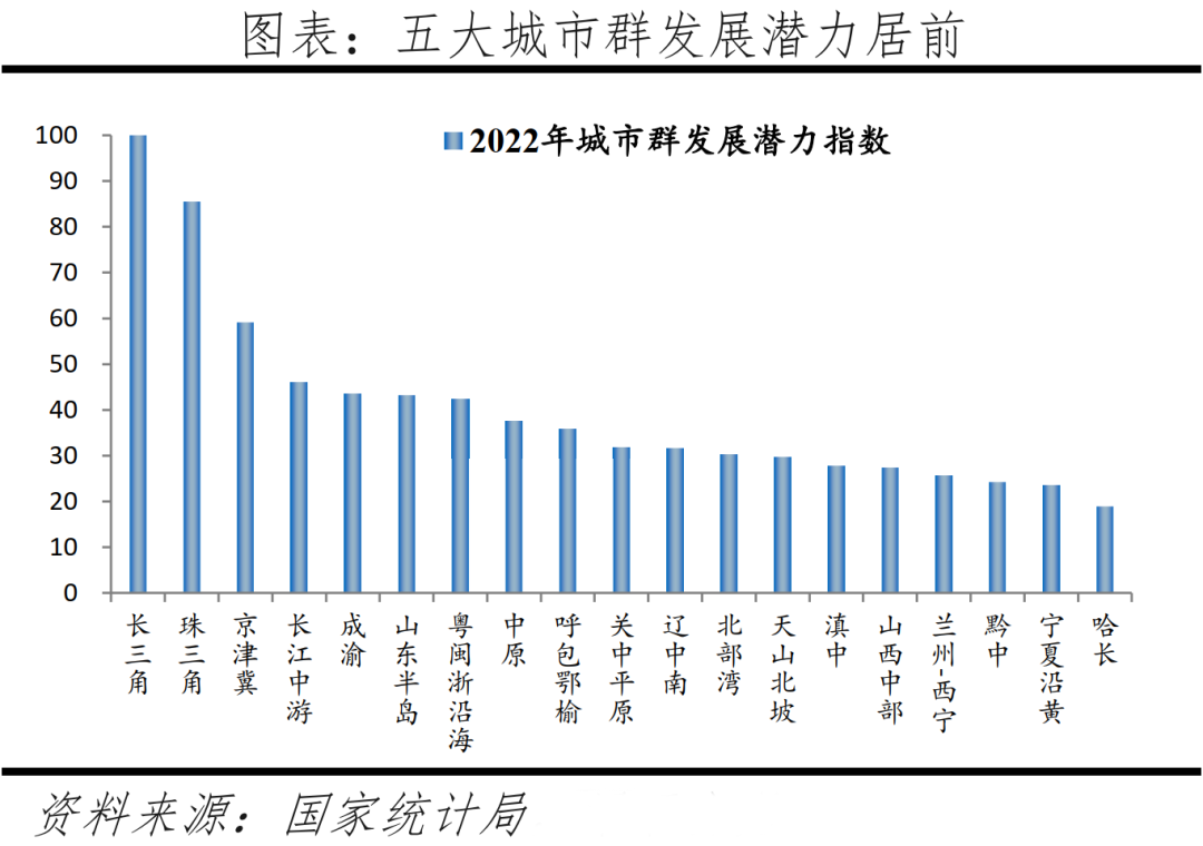 其中,五大城市群以全國(guó)13%的土地集聚了47.8%的人口,創(chuàng)造了60.3%的GDP,成為帶動(dòng)中國(guó)經(jīng)濟(jì)高質(zhì)量發(fā)展的主要平臺(tái)。從發(fā)展?jié)摿ε琶Y(jié)果看,長(zhǎng)三角、珠三角房地產(chǎn)投資潛力指數(shù)遙遙領(lǐng)先,其次是京津冀、長(zhǎng)江中游、成渝城市群,之后是山東半島、粵閩浙沿海、中原等城市群。