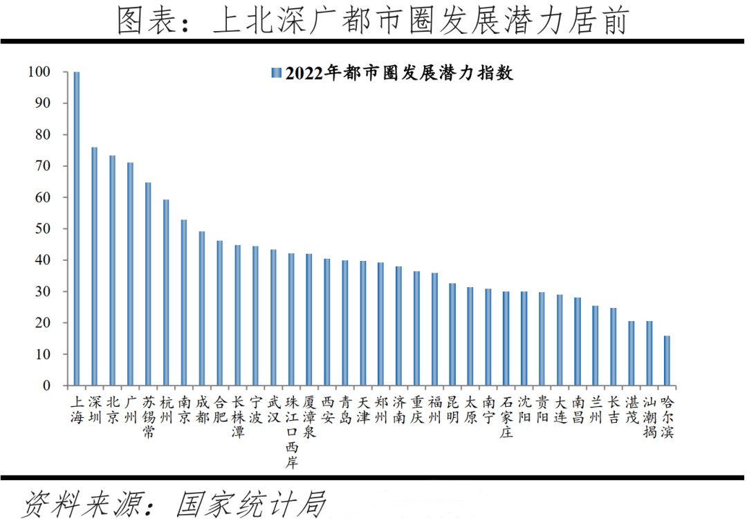 在都市圈層面,34個(gè)千萬級(jí)都市圈以18.6%的土地集聚63%的人口創(chuàng)造約78%的GDP,其中上海、深圳、北京、廣州等都市圈發(fā)展?jié)摿忧啊?/p>