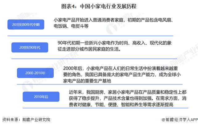 中國小家電行業(yè)發(fā)展歷程可以分為四個階段,20世紀80年代中期小家電產(chǎn)品開始進入普通消費者家庭,初期的產(chǎn)品包含電風扇、電飯鍋、電熨斗等;20世紀90年代新興小家電作為時尚的象征開始走入城市居民生活;2000年后,小家電產(chǎn)品在人們的日常生活中扮演著越來越重要的角色,中國也開始成為小家電重要的生產(chǎn)基地;2010年后,產(chǎn)品質(zhì)量和穩(wěn)定性穩(wěn)步提高,健康、節(jié)能、便捷、智能和養(yǎng)生等需求也刺激行業(yè)進一步發(fā)展。目前行業(yè)進入多品類、高質(zhì)量、智能化的全新階段。