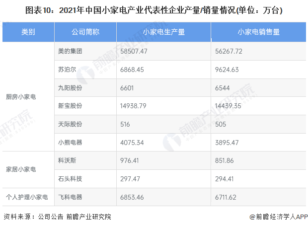 2021年,布局了小家電制造的上市企業(yè)中,美的集團、蘇泊爾、九陽股份、新寶股份、小熊電器、飛科電器的企業(yè)產(chǎn)量均在4000萬臺以上,規(guī)模較大,其中美的集團家電產(chǎn)品產(chǎn)量達到5.85億臺,產(chǎn)量規(guī)模位居全國第一。從產(chǎn)銷率來看,多數(shù)企業(yè)基本達到產(chǎn)銷平衡的狀態(tài),蘇泊爾呈現(xiàn)供不應(yīng)求的局面,其部分產(chǎn)能需要通過代工方式進行補充。小家電產(chǎn)業(yè)的代表性企業(yè)產(chǎn)量/銷量情況如下: