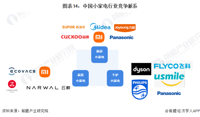 根據(jù)各市場主體主營產(chǎn)品的類型差異,中國小家電行業(yè)可以劃分為三個競爭派系。廚房小家電領(lǐng)域的主要參與者有美的集團、蘇泊爾、九陽股份、松下電器等;家居小家電產(chǎn)品主要包括掃地機器人、洗地機、無線吸塵器等產(chǎn)品,參與者包括科沃斯、石頭科技、小米科技、云鯨等品牌;個護小家電產(chǎn)品主要包括電吹風、電動剃須刀、電動牙刷等產(chǎn)品,市場參與者包括戴森、飛利浦、飛科電器、松下電器、USMILE等。