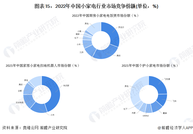 綜合來看,目前中國小家電行業(yè)龍頭企業(yè)是美的集團,其小家電業(yè)務(wù)營收規(guī)模遙遙領(lǐng)先,但具體至三個競爭派系中佼佼者各異。廚房小家電(以首要產(chǎn)品電飯煲為例)領(lǐng)域,2022年前4個月,蘇泊爾市場份額達到30.9%,占據(jù)第一;美的集團、九陽股份位列第二、三名,市場份額分別為26.8%及10.2%。家居小家電(以首要產(chǎn)品掃地機為例)領(lǐng)域,2021年,科沃斯憑借旗下科沃斯掃地機器人及添可洗地機良好的市場口碑,占據(jù)了家居小家電領(lǐng)域45%的市場份額;小米科技、石頭科技市場份額分別為16%及14%。在個護小家電領(lǐng)域,2021年飛利浦占據(jù)了24.6%市場份額排名第一,飛科電器及戴森分別占據(jù)11.7%及10.5%的市場份額。