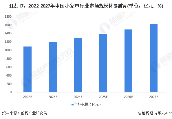 2021年,由于原材料價格上漲、宅經(jīng)濟減弱、上年市場規(guī)模基數(shù)較大等原因,中國小家電行業(yè)整體市場規(guī)模增速僅為0.99%,市場規(guī)模達到1017億元。展望未來,廚房小家電目前市場規(guī)模占據(jù)了小家電行業(yè)“半壁江山”,但行業(yè)、產(chǎn)品較為成熟,競爭格局穩(wěn)定,廚房小家電未來增速有所放緩;而家居小家電、個護小家電領(lǐng)域,在消費升級的刺激下,產(chǎn)品也不斷創(chuàng)新升級,推陳出新滿足當下需求熱點,行業(yè)競爭較為充分,行業(yè)整體成長性良好,未來行業(yè)將保持中高增速。經(jīng)初步測算,2027年,中國小家電行業(yè)市場規(guī)模約為1611億元。