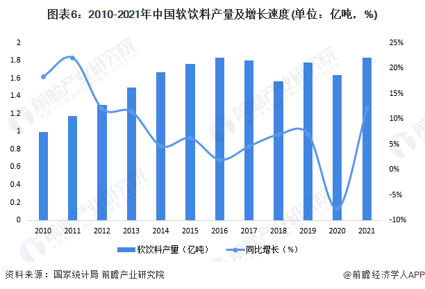 國(guó)家統(tǒng)計(jì)局?jǐn)?shù)據(jù)顯示,2010-2021年,我國(guó)軟飲料產(chǎn)品產(chǎn)量呈現(xiàn)增長(zhǎng)趨勢(shì),但增長(zhǎng)速度總體波動(dòng)下降。2017-2018年,我國(guó)軟飲料產(chǎn)量下滑,到2019年有所恢復(fù),2019年我國(guó)軟飲料產(chǎn)量為1.78億噸,同比增長(zhǎng)13.29%;2020年受疫情影響,軟飲料產(chǎn)量為1.63億噸;2021年我國(guó)軟飲料產(chǎn)量回升至1.83億噸,同比增長(zhǎng)12%,回到與2016年相同的近十年高點(diǎn)水平。