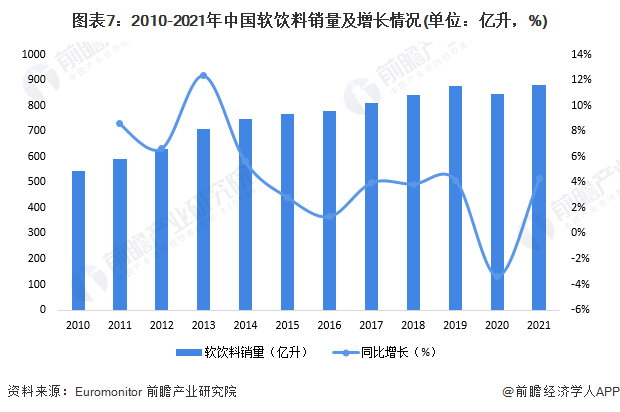 中國(guó)作為全球第二大軟飲料市場(chǎng),僅次于美國(guó),近年來(lái)軟飲料需求不斷增長(zhǎng)。根據(jù)Euromonitor的數(shù)據(jù),2010-2021年,中國(guó)軟飲料銷量逐年上升,不過(guò)增速有所放緩。2020年疫情期間,大多數(shù)商店關(guān)門,由于居家隱居和禁止社交聚會(huì),人們無(wú)法與親朋好友相聚和慶祝,軟飲料銷量下滑3.4%;2021年中國(guó)軟飲料銷量為883.05億升,同比增長(zhǎng)4.3%。
