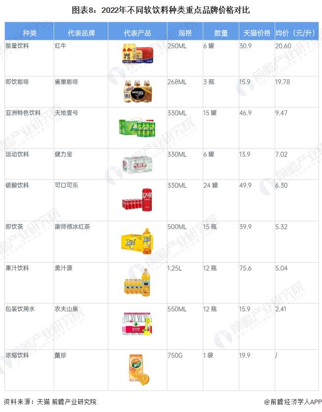 從軟飲料各大重點(diǎn)品牌價(jià)格對(duì)比中可以看出,包裝飲用水作為成本最低的軟飲料,均價(jià)在幾類軟飲料中最低僅為2.41元/升;以紅牛為代表的能量飲料和以雀巢咖啡為代表的即飲咖啡價(jià)格最高,均價(jià)分別達(dá)20.60元/升和19.78元/升;亞洲特色飲料排名第三,均價(jià)接近10元/升,在軟飲料中價(jià)格偏高。