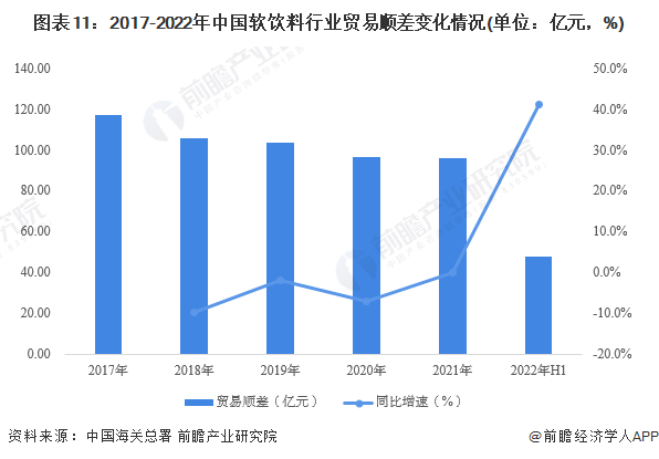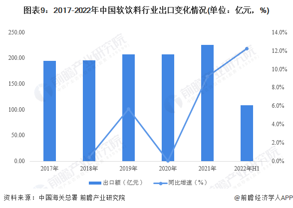 根據(jù)中國(guó)海關(guān)總署數(shù)據(jù),2017-2021年,中國(guó)軟飲料出口金額持續(xù)上升。2020年受疫情影響,中國(guó)軟飲料出口增速降至最低,隨后在2021年增速快速回升至9.2%,2021年全年軟飲料出口金額達(dá)225.81億元。2022年上半年,中國(guó)軟飲料行業(yè)的出口規(guī)模達(dá)108.38億元,同比增長(zhǎng)12.2%。