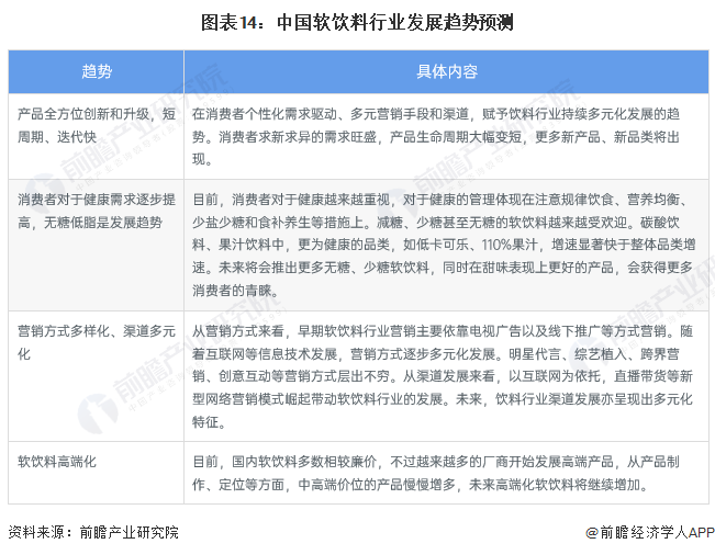 中國(guó)軟飲料行業(yè)在消費(fèi)者個(gè)性化需求驅(qū)動(dòng)、營(yíng)銷手段和渠道多元化發(fā)展的大背景下,軟飲料產(chǎn)品生命周期大幅變短,更多新產(chǎn)品、新品類將出現(xiàn);隨著消費(fèi)者對(duì)于健康越來(lái)越重視,減糖、少糖甚至無(wú)糖的軟飲料越來(lái)越受歡迎。另外,從營(yíng)銷方式上來(lái)看,綜藝植入、跨界營(yíng)銷、創(chuàng)意互動(dòng)等營(yíng)銷方式和直播帶貨等新型網(wǎng)絡(luò)營(yíng)銷模式將成為越來(lái)越多企業(yè)和品牌的選擇。