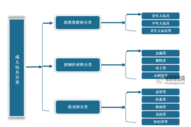 成人玩具按消費(fèi)群體分類,成人玩具可分為青年人玩具、中年人玩具、老年人玩具等;按制作材料分類,可分為金屬類、塑料類、電子類、木制類等;按功效分類,可分為益智類、治愈類、休閑類、競技類、懷舊類等,其中主要以休閑、益智為主。