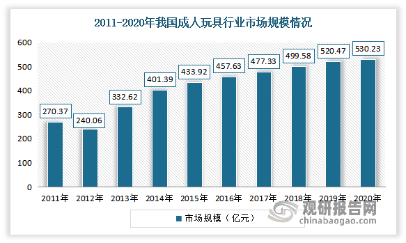 近年隨著我國經(jīng)濟(jì)的發(fā)展和居民生活水平的提高,居民開始注重精神層面的追求,玩具消費(fèi)的群體正在從兒童拓展到成年人,更多高檔、新穎的玩具逐漸成為成年人的消費(fèi)首選,促使成人玩具消費(fèi)規(guī)模迅速壯大。數(shù)據(jù)顯示,2020年我國成人玩具行業(yè)市場規(guī)模由2011年的270.37億元增長至530.23億元。