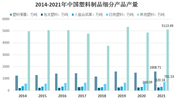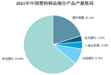 國內塑料制品產(chǎn)品門類眾多,從細分市場來看,2021年我國塑料薄膜產(chǎn)量1608.71萬噸,占比20.1%;日用塑料產(chǎn)量701.53萬噸,占比8.76%;人造合成革產(chǎn)量320.16萬噸,占比4%;泡沫塑料產(chǎn)量260.09萬噸,占比3.25%;其它塑料產(chǎn)量5113.49萬噸,占63.89%。