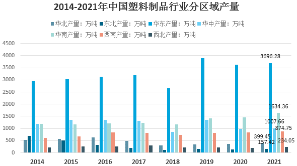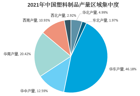 從生產(chǎn)的區(qū)域分布來看,國內塑料制品生產(chǎn)集中在華東、華南、華中地區(qū)。2021年,華東地區(qū)塑料制品產(chǎn)量3696.28萬噸,占全國的比重為46.18%。華南地區(qū)發(fā)展迅速,塑料制品產(chǎn)量1634.36萬噸,占比20.42%。華中地區(qū)塑料制品產(chǎn)量1007.66萬噸,占比12.59%。其他地區(qū)塑料制品產(chǎn)量均在千萬噸以下,其他地區(qū)合計占比20.81%。