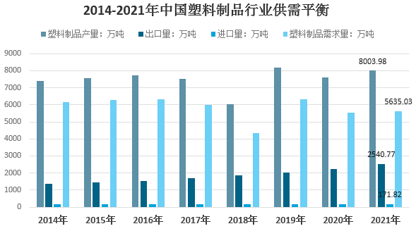 根據(jù)海關數(shù)據(jù),2021年我國塑料制品行業(yè)進口171.82萬噸,出口2540.77萬噸,結合國內產(chǎn)量來看,2021年我國塑料制品行業(yè)表觀需求量達到5635.03萬噸。
