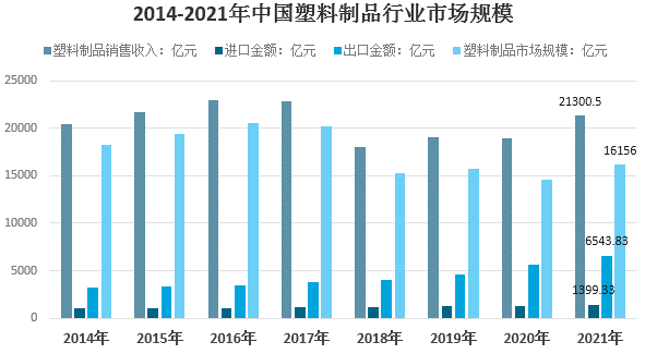 受益于上游原材料價格上漲,國內塑料制品市場止跌回暖。2021年我國塑料制品生產(chǎn)企業(yè)營業(yè)收入約21300.5億元,營業(yè)收入同比增長12.76%。2021年我國塑料制品行業(yè)市場規(guī)模約16156億元,市場同比增長10.7%。