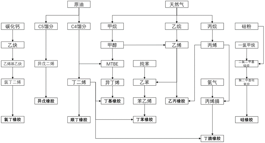 合成橡膠主要生產(chǎn)原料為丁二烯,原料端來(lái)看,第一種工藝路徑是從原油出發(fā),通過(guò)石腦油裂解工藝獲得混合C4,并從中抽提丁二烯。第二種工藝路徑是從天然氣出發(fā),通過(guò)乙烷制乙烯裂解裝置副產(chǎn)混合C4,并從中抽提丁二烯。除丁二烯外,合成橡膠生產(chǎn)原料包括苯乙烯、異丁烯、異戊二烯、丙烯腈等多種單體中間物。