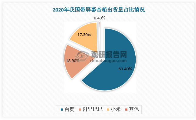 帶屏幕音箱市場(chǎng)中,百度憑借優(yōu)越的人工智能語(yǔ)音技術(shù),出貨量占比最大,2020年為63.4%;其次是阿里巴巴和小米,帶屏幕音箱出貨量占比18.9%、17.3%。