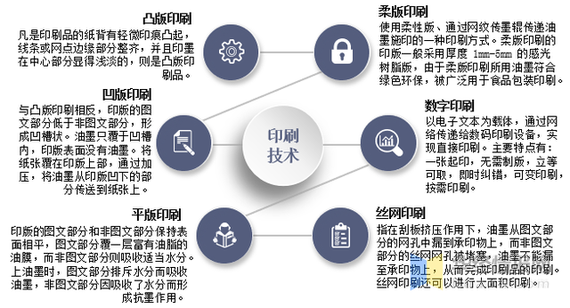 印刷是包裝的前道工序,目前的印刷技術(shù)主要分為柔版印刷、凸版印刷、凹版印刷、平版印刷、絲網(wǎng)印刷、數(shù)字印刷六大類。