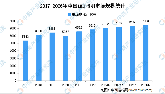 隨著中國(guó)LED照明滲透率進(jìn)一步提升,中國(guó)LED照明市場(chǎng)規(guī)模保持較大幅度增長(zhǎng),按下游應(yīng)用環(huán)節(jié)產(chǎn)值計(jì)算,由2017年的5343億元上升到2021年的6552億元,年均復(fù)合增長(zhǎng)率為5.2%。隨著行業(yè)發(fā)展?jié)u趨穩(wěn)定,預(yù)計(jì)LED照明市場(chǎng)規(guī)模將由2022年的6813億元增長(zhǎng)到2026年的7386億元,年均復(fù)合增長(zhǎng)率將達(dá)到2.0%。