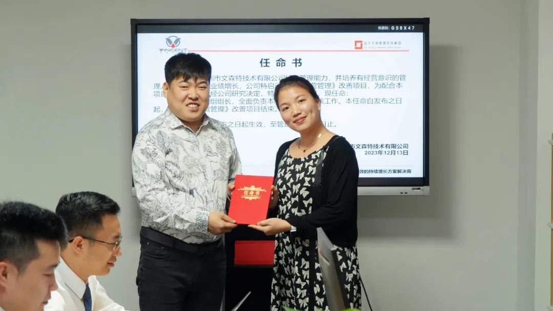 會上,吳總為項目老師頒發(fā)授權(quán)書,授予項目老師項目管理權(quán)利,同時為公司項目團隊成員頒發(fā)任命書,明確職責(zé),強化責(zé)任,確保項目的有效落地。