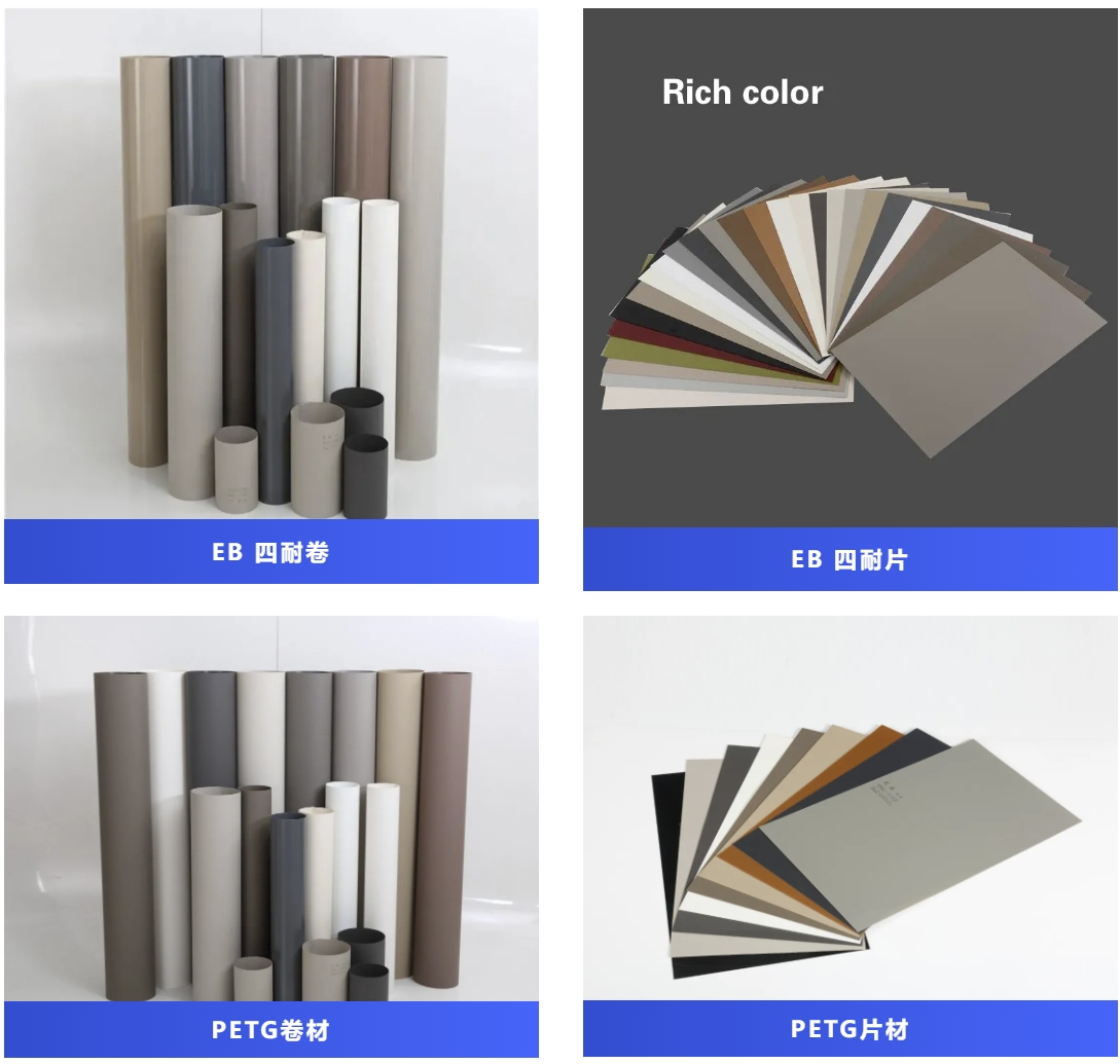 公司產(chǎn)品主要包括PETG膚啞卷材/片材、高光卷材/片材、EB 卷材/片材以及配套全系同色封邊條,產(chǎn)品性能表現(xiàn)出色,顏色穩(wěn)定、高硬度、超耐磨、防劃花、抗指紋、熱修復(fù)、耐干熱、耐污染、耐灼燒、耐黃變。