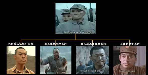 案例:李云龍如何構(gòu)建核心團(tuán)隊(魏和尚:解救后吸引而來;孫連長:用五挺重機(jī)槍從別的隊伍挖過來;張營長:自己培養(yǎng)提拔起來,是打出來的;趙政委:上級委派而來。